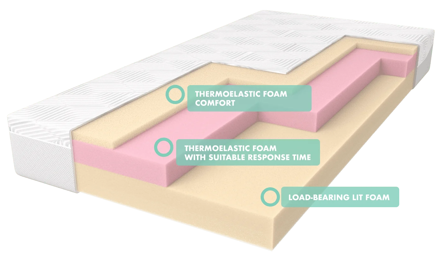 The base of the mattress is made of 11 cm thick, load-bearing LIT foam, able to support up to 170 kg body weight per person. The middle layer is formed of 8 cm thick thermoelastic foam with suitable response time and composition selected to match our climate zone. The top layer is thermoelastic COMFORT foam of 3 cm thickness, that allows for an easy position change and a pleasant feeling in the first contact.
